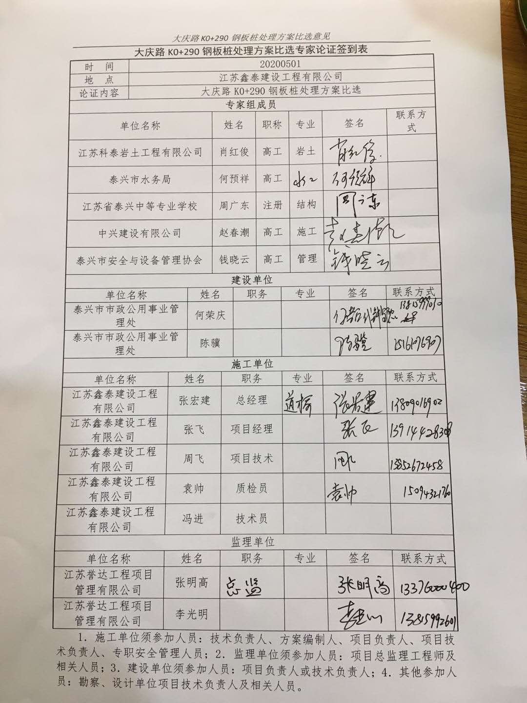 2020年5月1日下午14时,大庆路改造工程二标段项目部在公司六楼会议室召开有关“大庆路K0+290钢板桩处理方案”专家论证会。特邀安全站专家库五位施工专家出席会议。市市政公用事业管理处,施工单位及监理单位相关人员参加了会议。