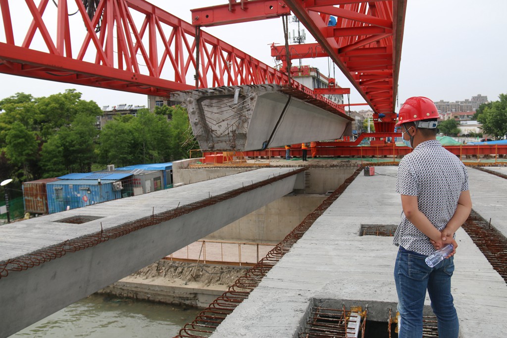 公园桥改造工程主要任务是将过去的10.5米宽改造为26.8米宽。全桥共计25m长小箱梁27片。设计采用先简支后连续的工艺。此次安装主要采用180T架桥机进行吊装。施工过程中,项目技术人员全程跟踪测量,安全员坚守岗位。所有施工步骤严格按照审批过的专项方案实施。